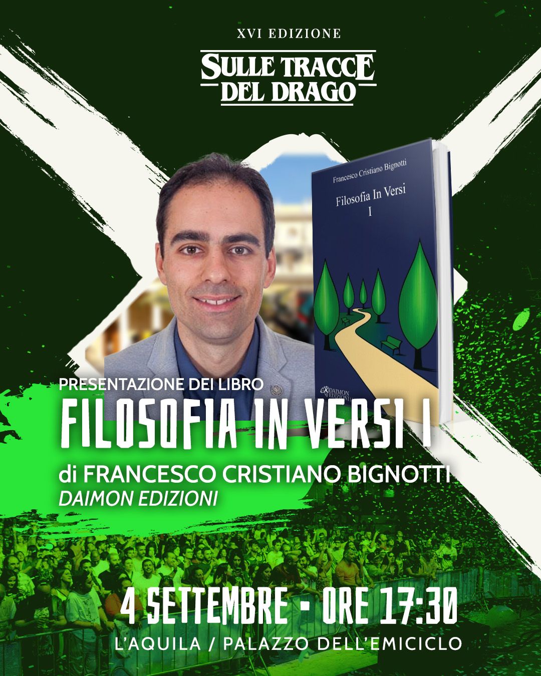 Sarà la giornata inaugurale dell’edizione 2025 della kermesse fantasy Sulle Tracce del Drago a ospitare la presentazione dell’ultima opera letteraria di Francesco Cristiano Bignotti. Alle 17:30 lo scrittore aquilano sarà al Palazzo dell’Emiciclo per parlare di questa nuova avventura editoriale. Dopo la strepitosa vittoria del 2023 del Premio Internazionale Città di Latina con la silloge Tutti i miei passi e il grande seguito del format su Poesia: femminile, singolare di 𝑭𝑰𝑽 – 𝑭𝒊𝒍𝒐𝒔𝒐𝒇𝒊𝒂 𝑰𝒏 𝑽𝒆𝒓𝒔𝒊, l’autore pubblica un’opera profondamente creativa e arricchente: il primo Quaderno “FIV I – Filosofia In Versi”. Un quaderno A5 di versi e riflessioni da Platone a Heidegger, da Kant a Ronchi, con i testi poetici originali dell’autore. Un formato comodo per un invito alla lettura da parte del fecondo autore aquilano e della Daimon Edizioni che, nel suo continuo intento divulgativo, vuole avvicinare i lettori al Bello e – perché no – al Sublime. Perché “seguire il proprio daimon” possa essere illuminante senza essere eccessivamente oneroso.