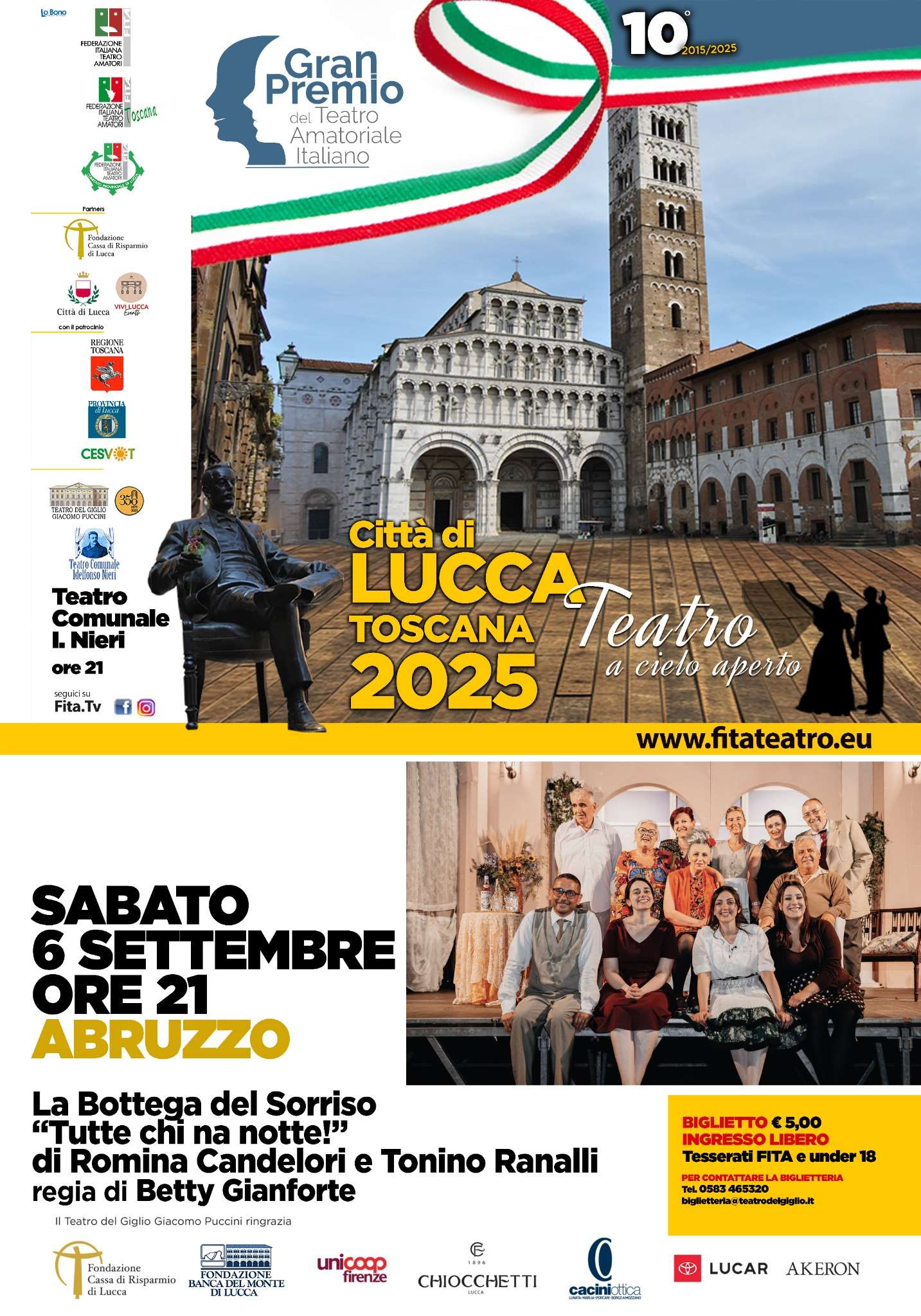 Dopo un’estate trascorsa sulle piazze abruzzesi, la Compagnia Teatrale “La Bottega del Sorriso” di Castelnuovo Vomano, parte per un’altra bellissima avventura. Selezionata dalla FITA (Federazione Italiana Teatro Amatoriale) Abruzzo, rappresenterà la nostra Regione nel Gran Premio Del Teatro Amatoriale Italiano in Toscana. Sedici compagnie di altrettante regioni italiane si stanno esibendo sul palcoscenico del prestigioso Teatro Nieri di Lucca, nella rassegna iniziata il 5 aprile e che si concluderà il 16 novembre con la premiazione dei migliori. La Bottega opera da ventinove anni sul territorio cercando di preservare la cultura, gli usi e i costumi della nostra terra con l’uso del dialetto. Innumerevoli i premi raccolti in questi anni ed un crescente consenso da parte di pubblico e critica l’hanno portata ad essere scelta come portabandiera del nostro Abruzzo in questa prestigiosa rassegna. La commedia che porterà in scena a Lucca è “Tutte chi na notte” di Romina Candelori e Tonino Ranalli, un giallo tragicomico. Anni Trenta, siamo in una località dell’Abruzzo montano, precisamente sul Gran Sasso. Una notte buia e tempestosa, la bufera di neve che infuria senza tregua e un gruppo di persone – personale di servizio e clienti – rimasto isolato in un albergo. Al culmine della nottata, tra lampi e tuoni, salta la corrente elettrica e, come spesso accade in questi casi… meglio non svelare troppo. Lasciamo al pubblico il gusto della suspense, l’incertezza di ciò che è già accaduto e di ciò che sta per succedere. Tra i personaggi – alcuni davvero particolari – emergono divergenze, vecchi rancori, amori mai sopiti, ambizioni e fragilità. Una vicenda apparentemente semplice, ma in realtà intricata, che fa sorridere e, allo stesso tempo, tiene con il fiato sospeso.