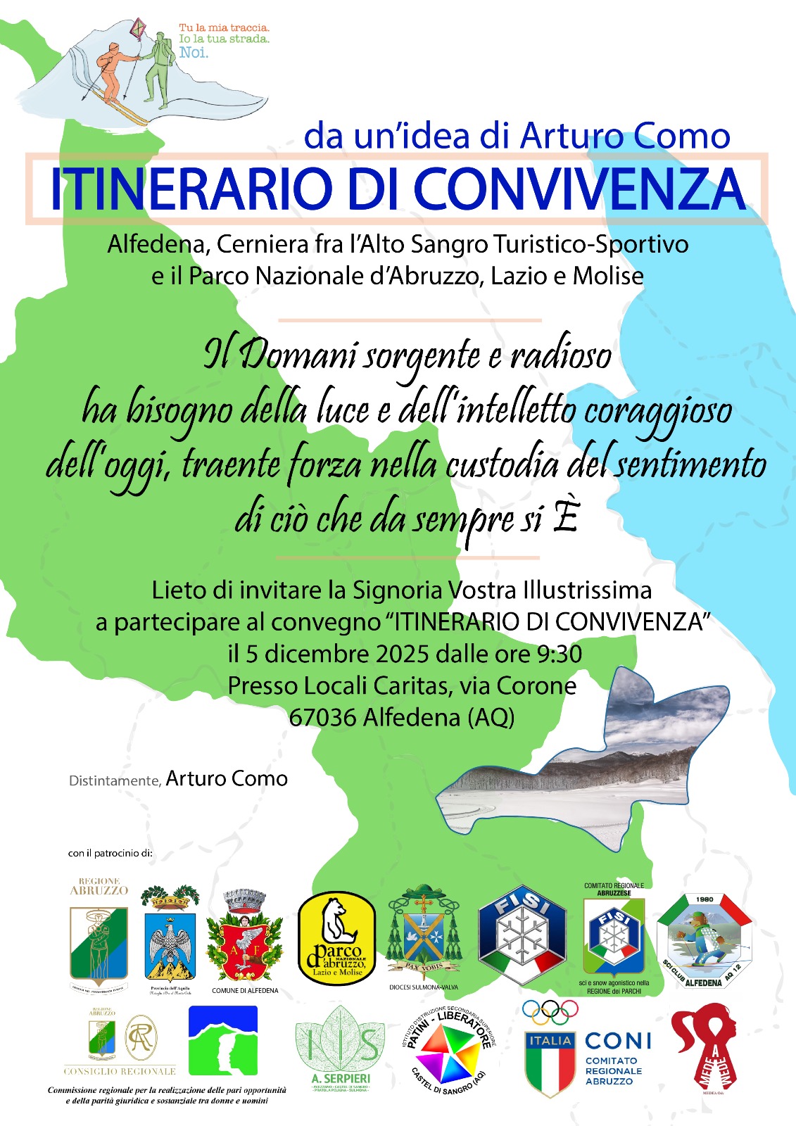 È da tanto che Arturo Como pensa e desidera Itinerario di Convivenza, perché da sempre è convinto assertore che lo sci di fondo può volgere a costruttore di economie differenziate e diffuse, perché può essere ministero di promozione turistica e territoriale, seppur non ne dispone deleghe dirette, perché è la biblioteca all’aria aperta che, forgia ad un conoscere nuovo, perché è un presidio di sicurezza della spiritualità e della legalità, perché è elemento reputazionale, perché salva i giovani dalla strada e li rende cittadini consapevoli ed attivi.